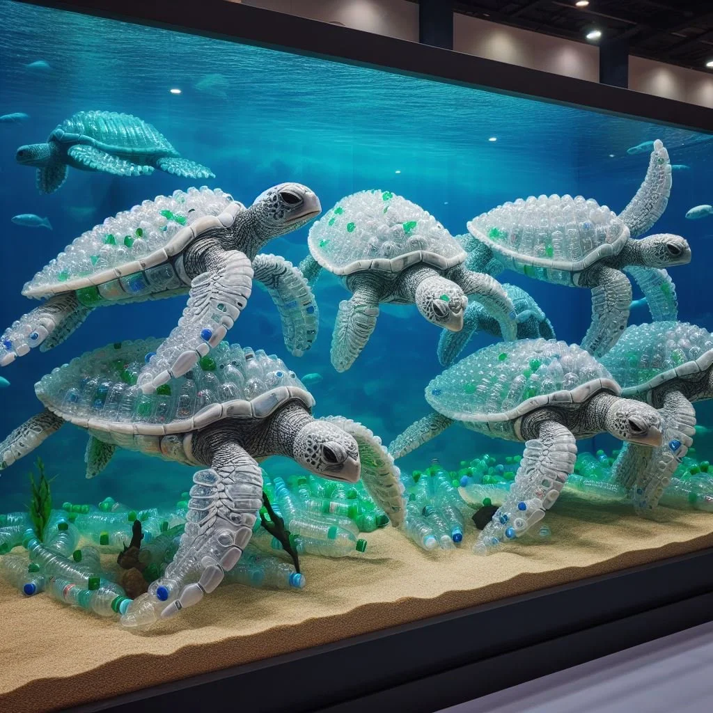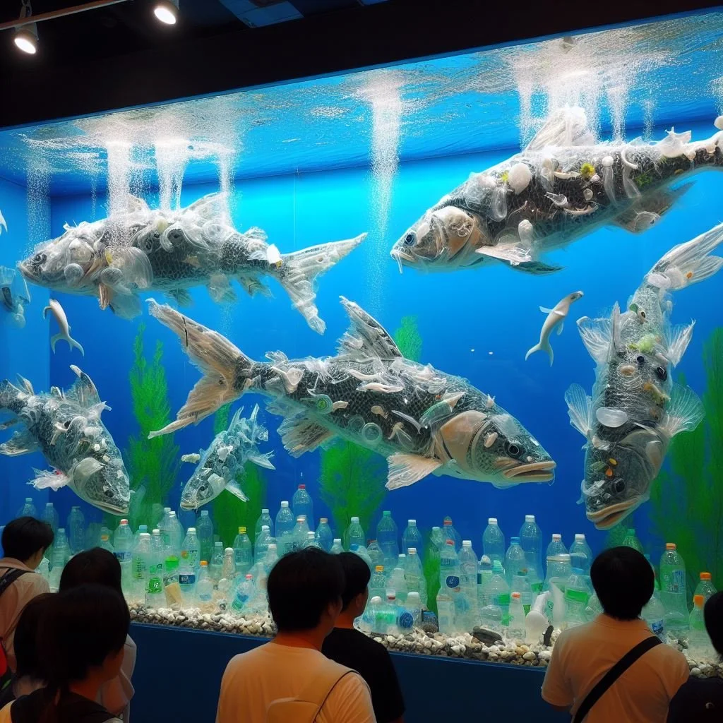Once inside, spectators will find that every living creature in the aquarium has been replaced with plastic trash lookalikes.